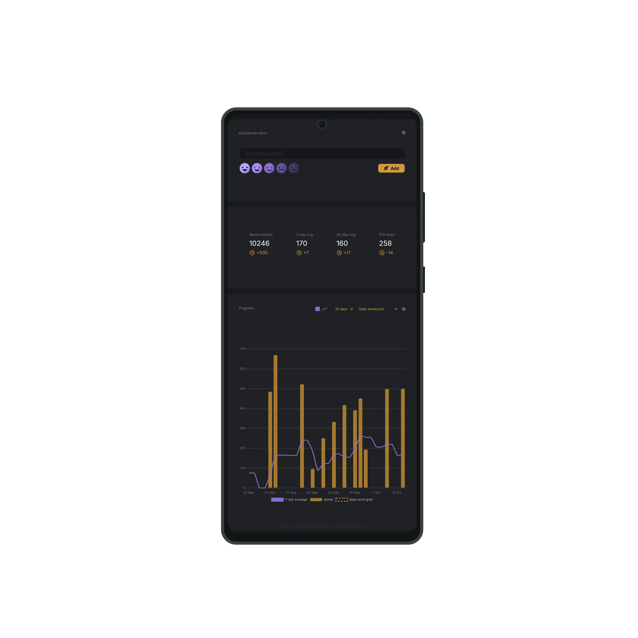 AuthorlyticaA quiet web app that helps you track writing momentum instead of just word counts. Works on any device, no installs or setup needed.