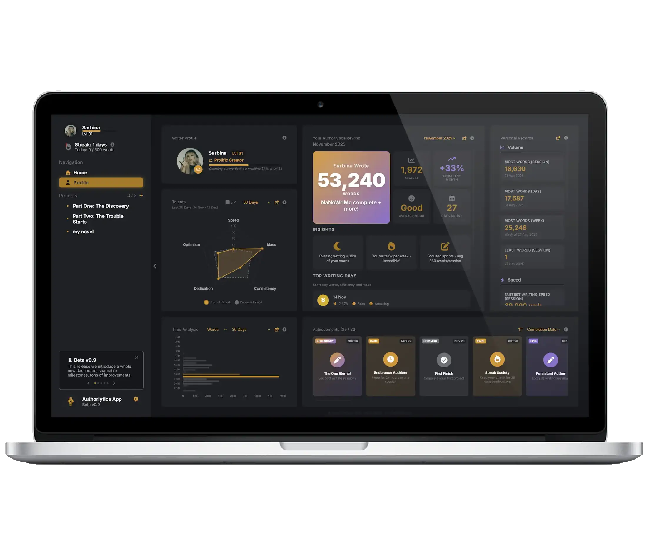 Most writing progress goes unnoticed, or is only tracked with a single wordcount. Authorlytica makes the momentum of your effort visible and makes finishing inevitable.